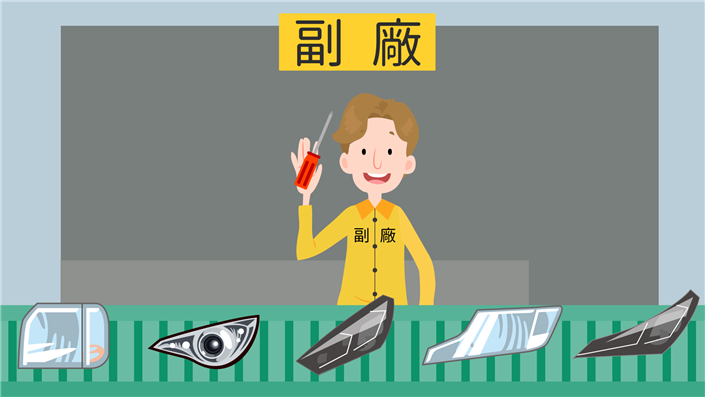 所謂副廠,即提供各種車燈零配件,給非汽車品牌直營或授權的維修廠進行維修或更換。副廠除了具價格競爭優勢外,有些零件經過加以調整和改良後,可彌補原廠零件不足之處。