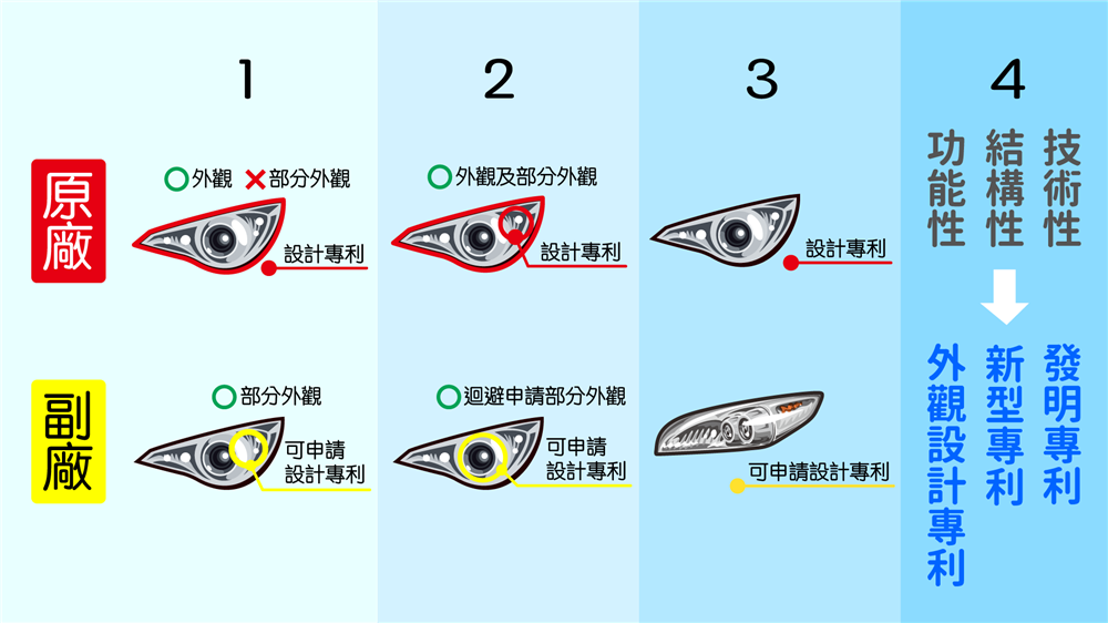 1.當原廠車燈有申請外觀設計專利,但卻未針對部分外觀申請設計專利;副廠可針對部分的外觀設計申請專利保護。