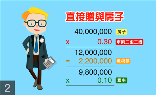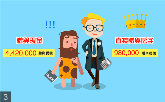 直接贈與4000萬的現金是442萬的贈與稅額;直接贈與4000萬的房子是98萬的贈與稅額