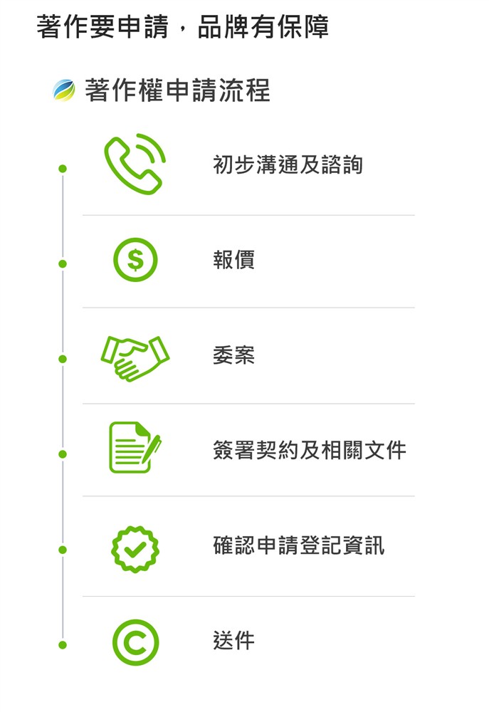 1.各類著作權之保護策略、規劃與諮詢顧問服務(包含:語文著作、音樂著作、建築著作、